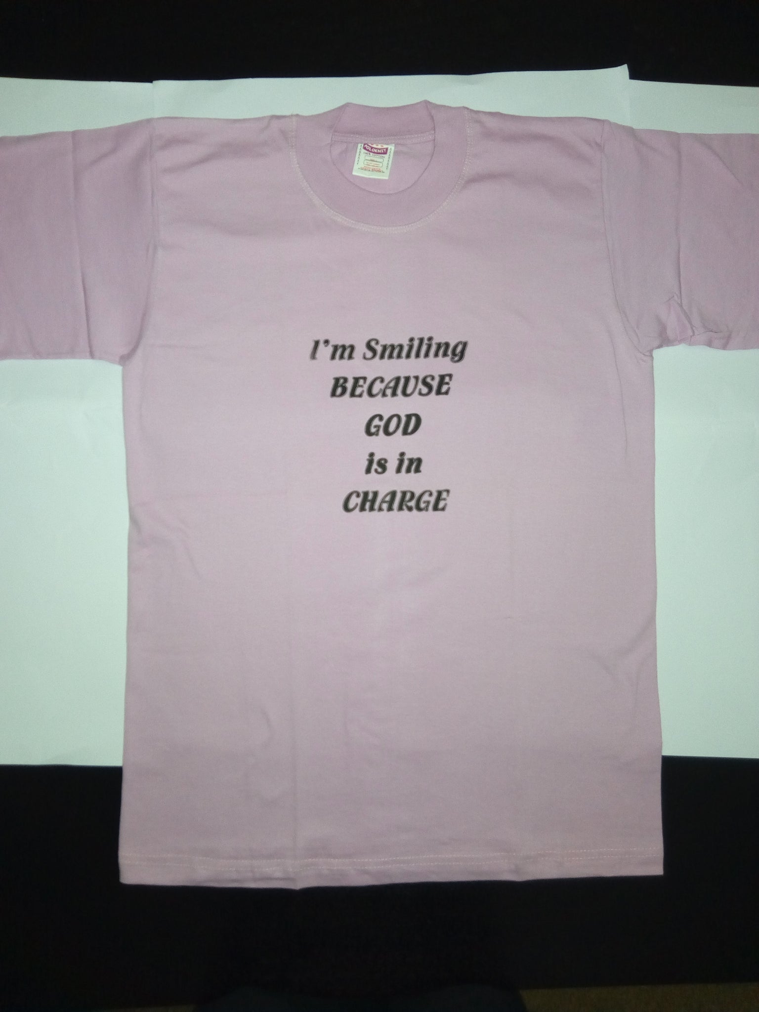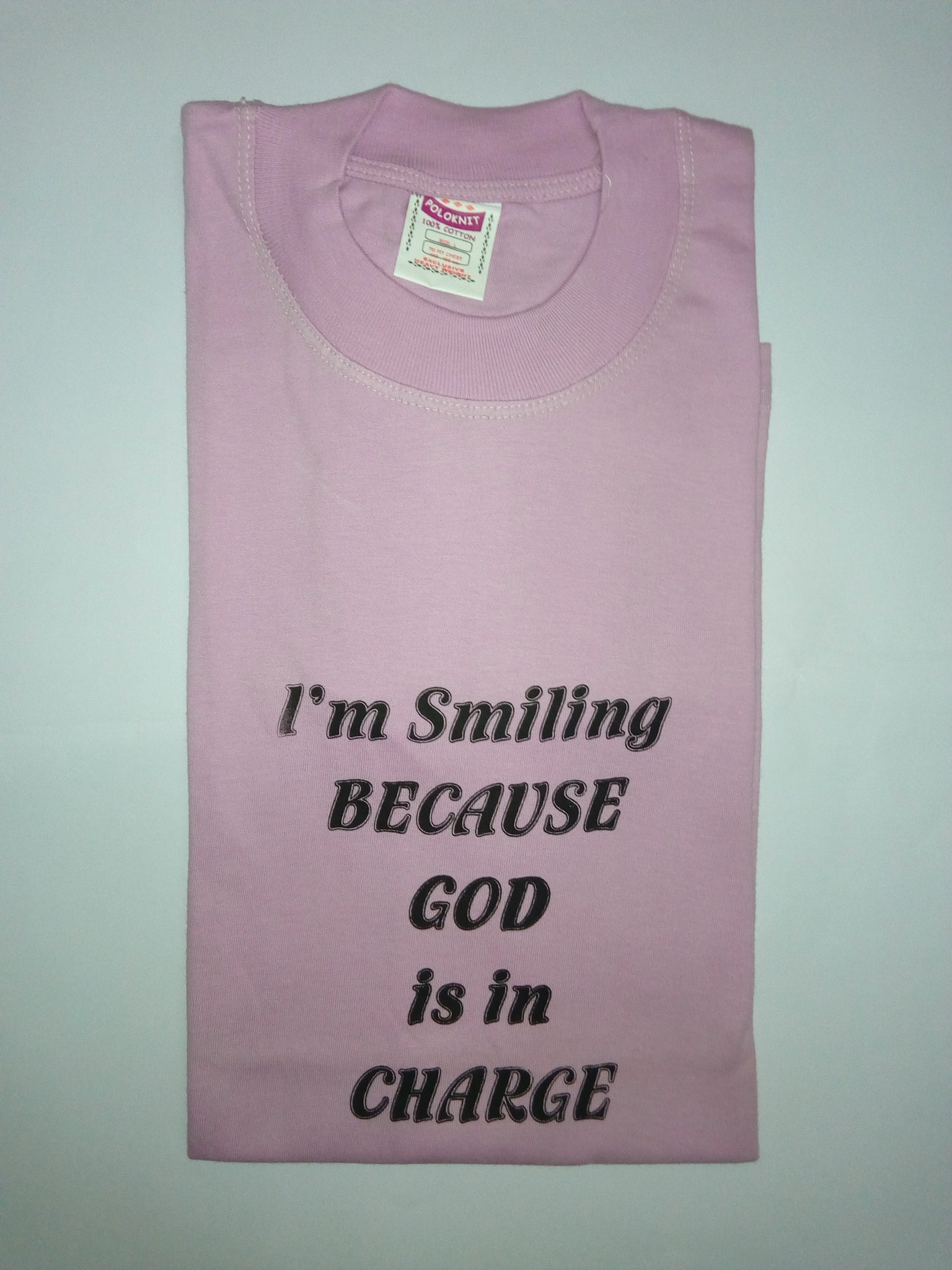 Beautiful Adult T-shirt with message "I'm Smiling BECAUSE GOD is in CHARGE."